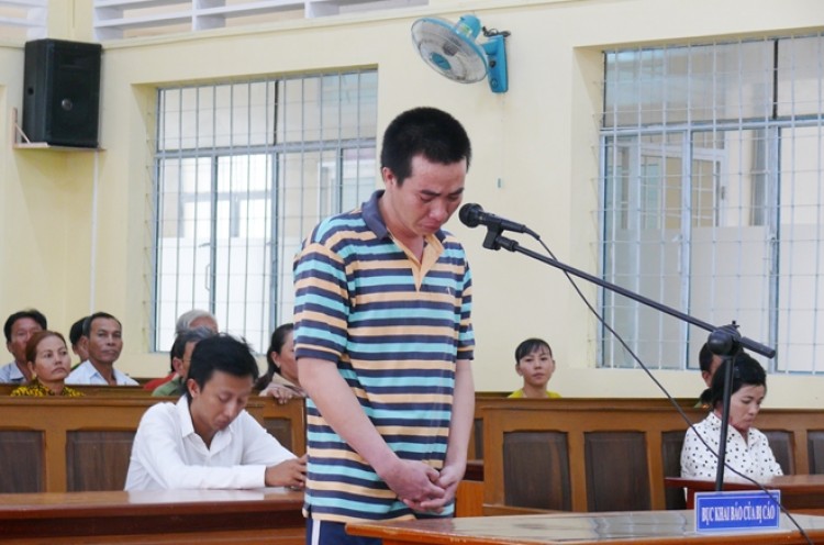 Tại tòa, người chồng luôn quay đầu nhìn về phía vợ. Khi được nói lời sau cùng, bị cáo khóc lóc, xin lỗi vợ cùng gia đình vợ.