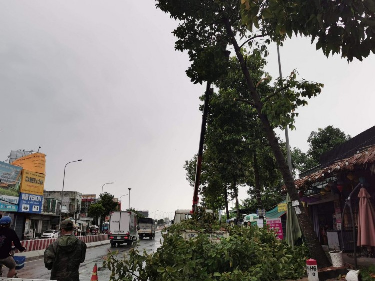 Đơn vị chuyên môn quận Ninh Kiều xử lý cây xanh bị đổ ngã do cơn mưa giông ngày 2-8-2020.