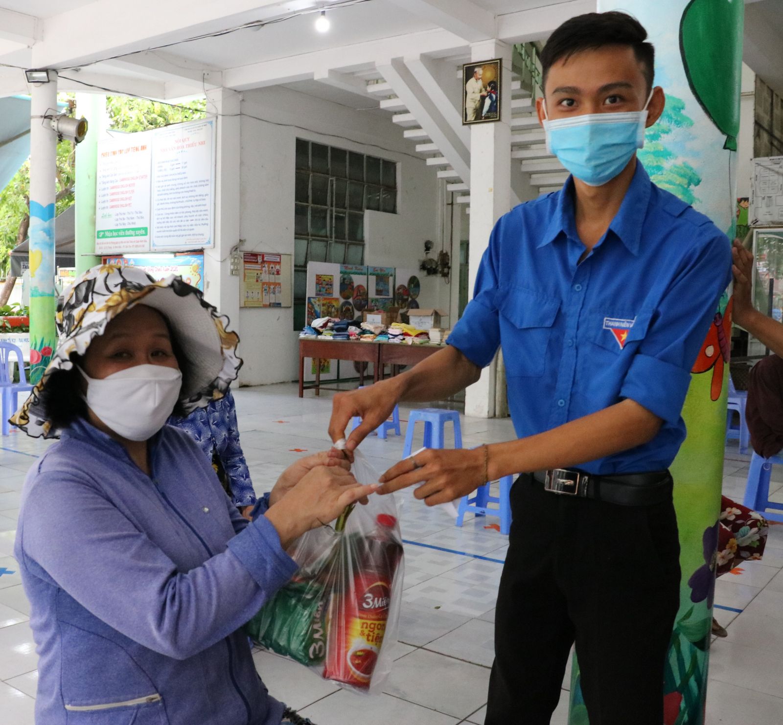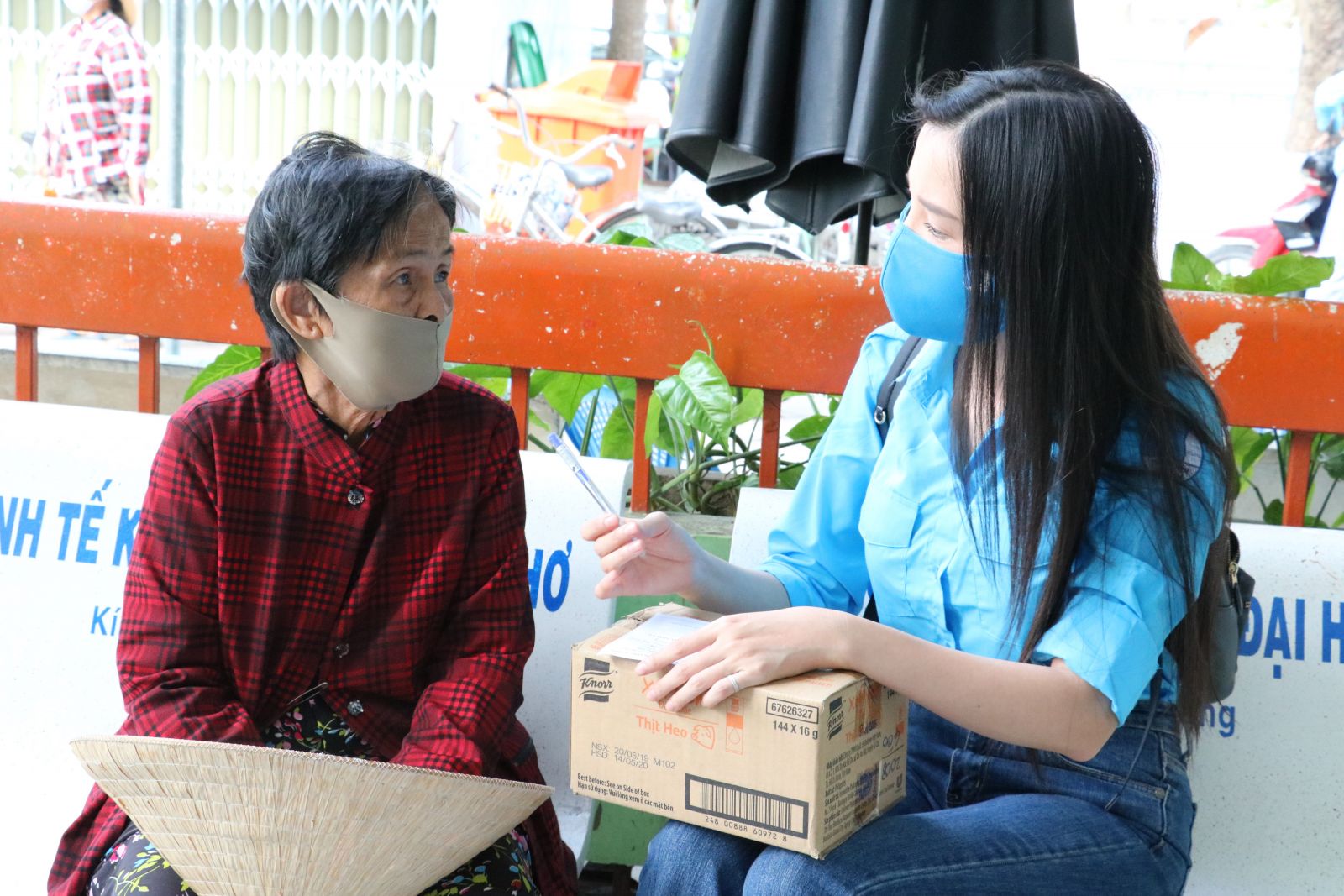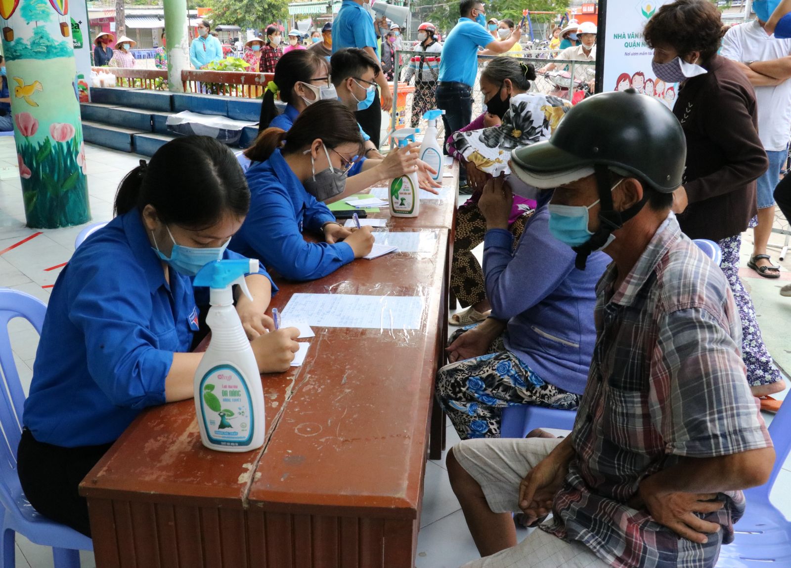 Những cụ già yếu sẽ được tình nguyện viên hỗ trợ ghi phiếu nhận thực phẩm.