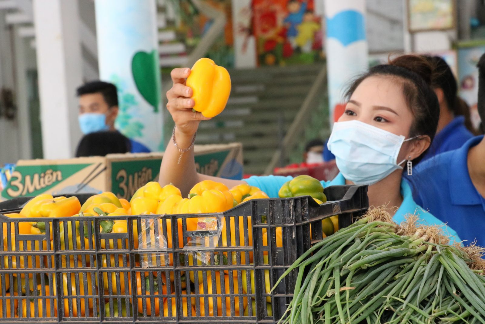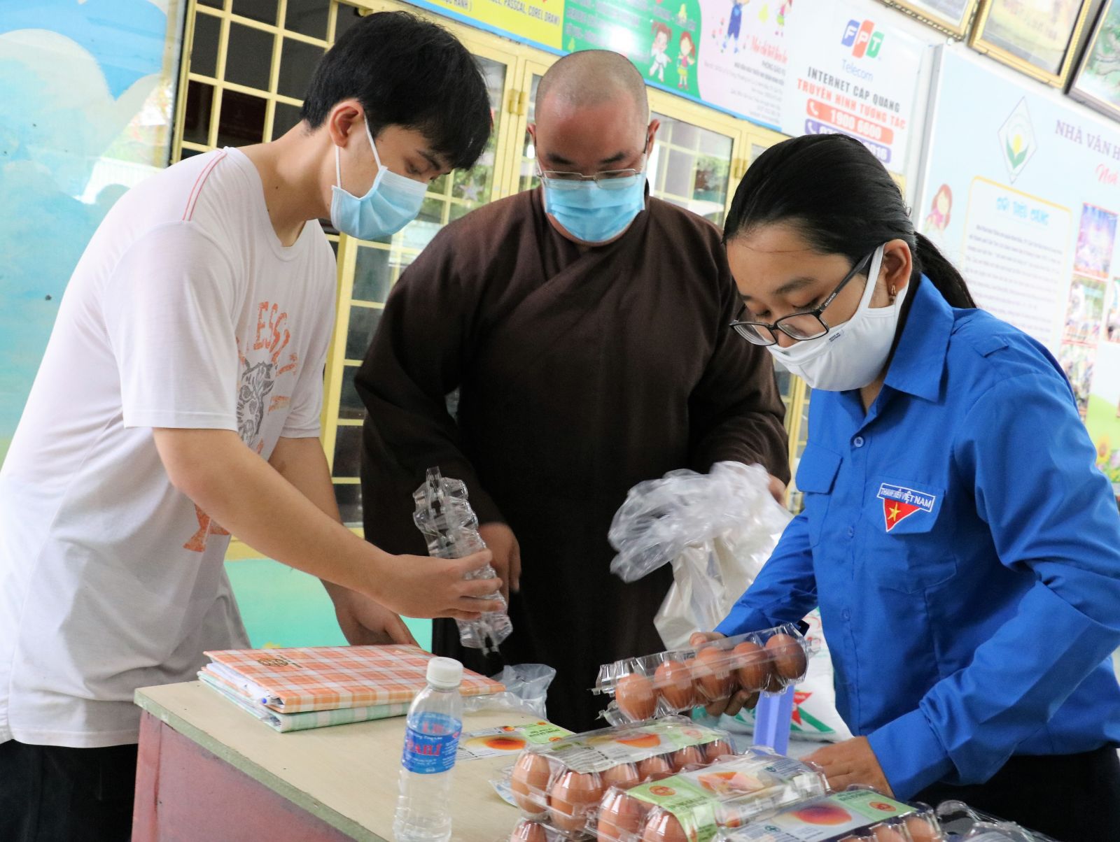 Nhiều nhà hảo tâm ủng hộ nhu yếu phẩm như: trứng, rau củ quả... Các bạn trẻ thì góp công, hỗ trợ Ban tổ chức trao thực phẩm cho người dân.