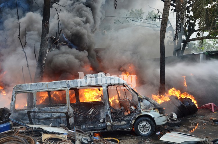 Do vật liệu cháy toàn vỏ xe bằng cao su, nên đám cháy bùng phát rất nhanh và dữ dội, cột khói bốc cao hàng chục mét bao trùm cả khu vực.