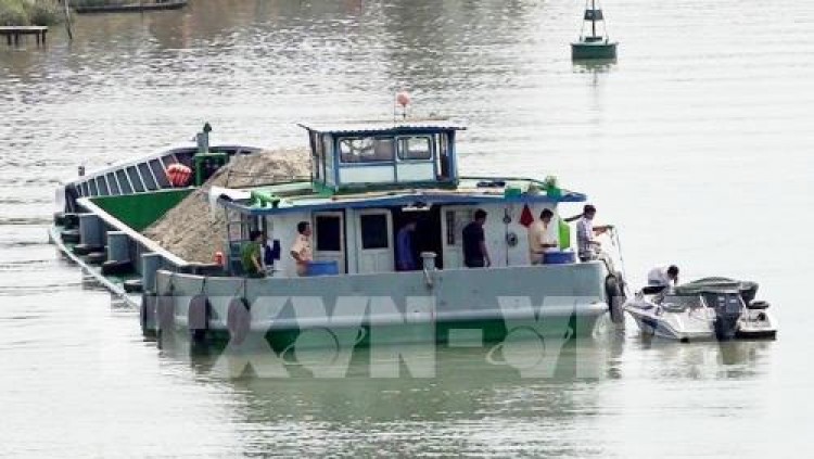 Lực lượng chức năng kiểm tra sà lan chở cát để điều tra nguyên nhân vụ tai nạn. Ảnh: Công Mạo-TTXVN