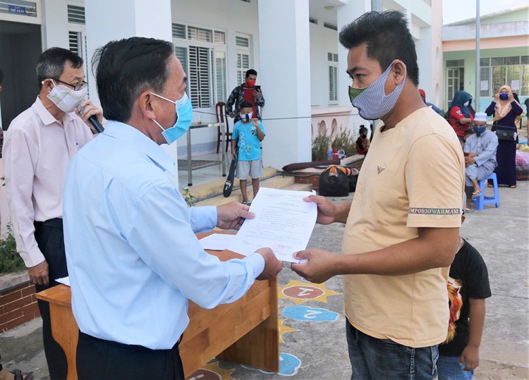 Phó Chủ tịch UBND TP. Châu Đốc Trần Quốc Tuấn trao giấy chứng nhận cho các công dân hoàn thành cách ly y tế tập trung