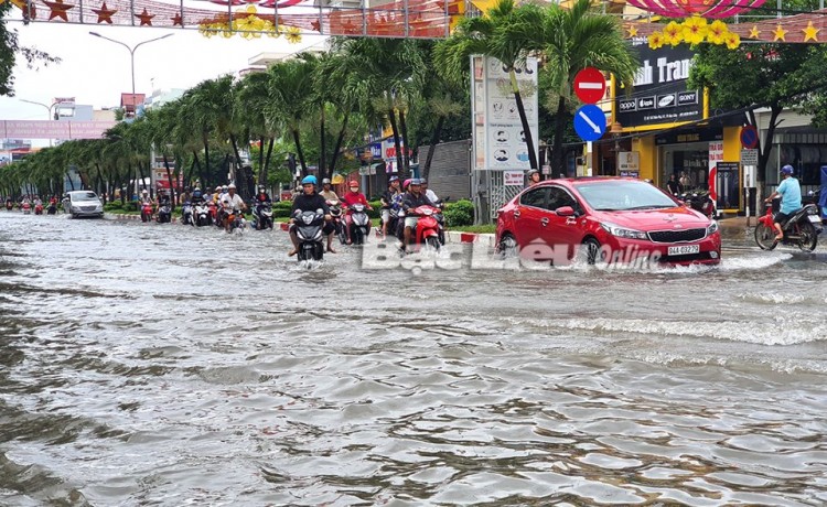 Tuyến đường Trần Phú (TP. Bạc Liêu) ngập nặng sau trận mưa kết hợp triều cường vào ngày 2-11-2020. Ảnh: C.L