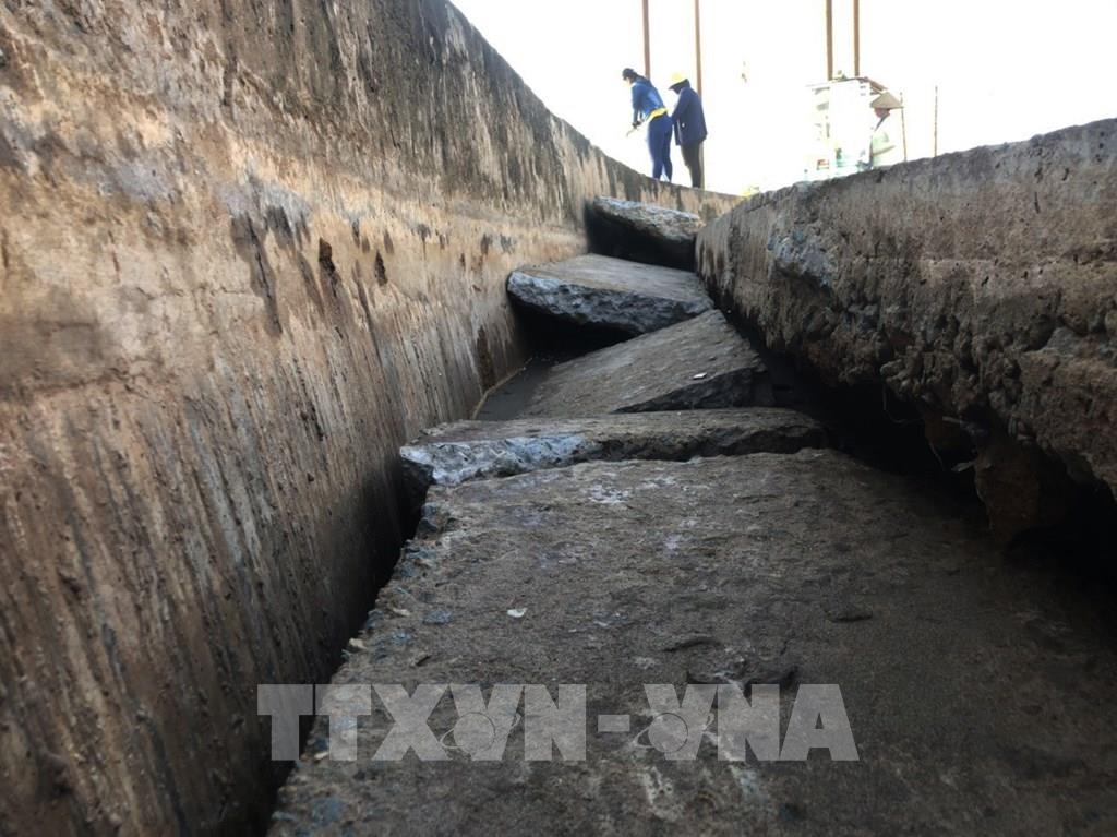 Đoạn sụt, lún đê, kè cửa biển Nhà Mát. Ảnh: Huỳnh Sử - TTXVN