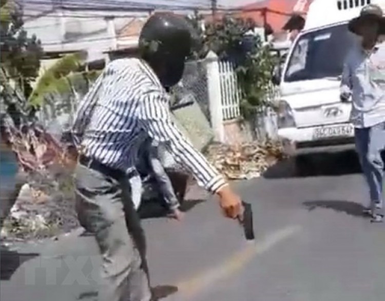 Ông Huỳnh Văn Đài cầm vật nghi là súng đe dọa người va chạm giao thông với ông. (Ảnh: TTXVN phát)