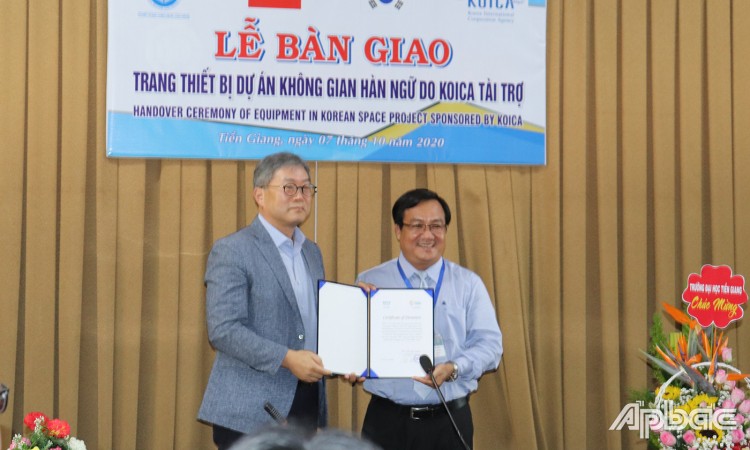 Đại diện Tổ chức KOICA, Hàn Quốc tại Việt Nam bàn giao trang thiết bị Dự án "Không gian Hàn ngữ" cho Trường Đại học Tiền Giang.