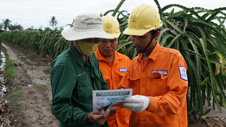 Cán bộ điện lực hướng dẫn người dân trồng thanh long sử dụng điện an toàn. Ảnh: VGP/Minh Thi