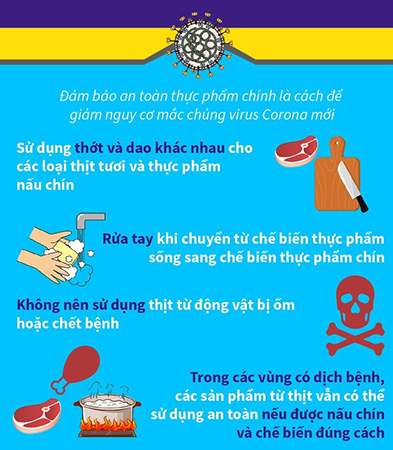 Theo khuyến cáo của ngành y tế, để phòng ngừa dịch bệnh Covid-19, các bà nội trợ cần lưu ý khi lựa chọn thực phẩm cho gia đình mình. Bà Phan Thị Diễm Thúy, Chi cục trưởng Chi cục An toàn vệ sinh thực phẩm tỉnh, khuyên: “Khi đi mua thực phẩm, người dân nên sử dụng găng tay, khẩu trang. Không sử dụng thịt vật nuôi bị oi, hỏng, tránh xa khu vực chứa chất thải và nước thải trong chợ. Tuyệt đối không tiếp xúc, sử dụng thịt động vật chết do bị bệnh vì đây là những nguồn gây bệnh nguy hiểm. Người dân cần rửa tay sạch bằng xà phòng hoặc các dung dịch sát khuẩn có cồn ngay sau khi tiếp xúc với gia súc, gia cầm và các loại thịt sống để tránh mang mầm bệnh về nhà”.