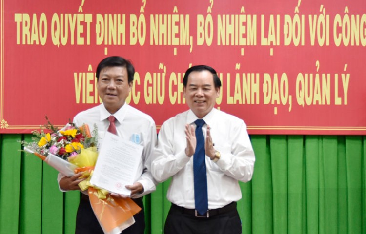 Chủ tịch UBND tỉnh Bến Tre Trần Ngọc Tam trao quyết định bổ nhiệm và tặng hoa cho đồng chí Phạm Thanh Hùng.