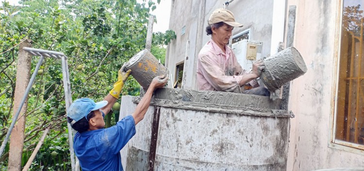 Người dân thị trấn Giồng Trôm xây ống hồ trữ nước mưa.