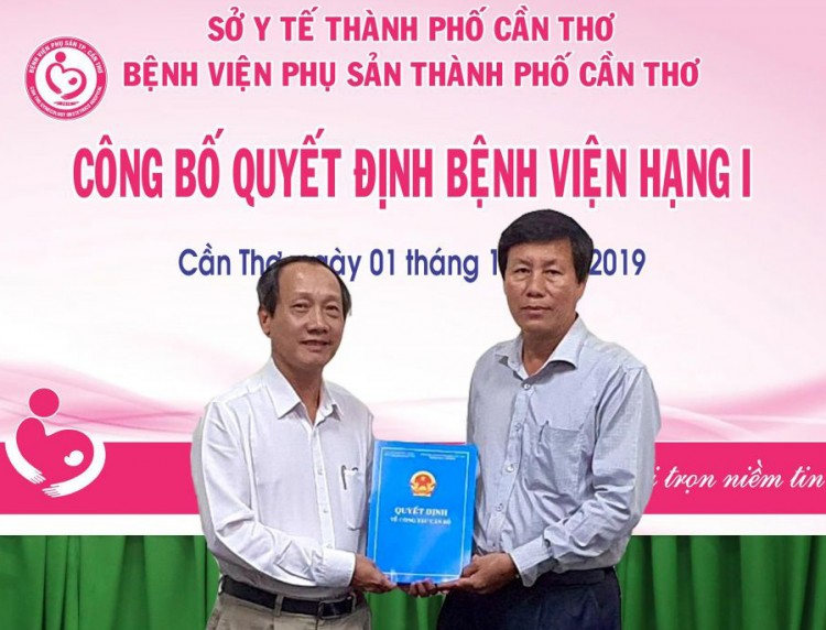 Bác sĩ CKII Cao Minh Chu, Giám đốc Sở Y tế TP Cần Thơ (bên phải), trao Quyết định BV hạng I cho BV Phụ sản TP Cần Thơ.
