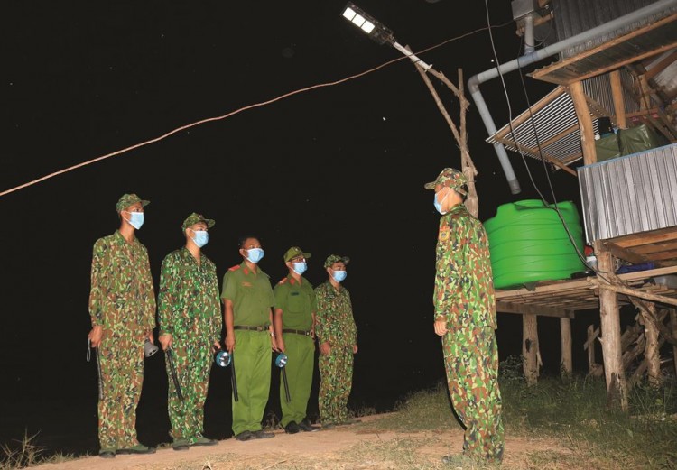 Chúng tôi lội qua con đường đê nhỏ hẹp- vừa mới ráo mặt bùn sau trận mưa đêm trước - để di chuyển từ chốt số 13 đến các chốt gần đó. Dọc theo quãng đường là hàng cột điện năng lượng mặt trời. Nương theo ánh điện ấy, cộng với đốm sáng ít ỏi của đèn pin trên tay, chúng tôi nghe biên giới "trở mình" trong đêm, đồng thời chịu đựng sự tấn công của đám côn trùng đang “bao vây” ngọn đèn. Trong màn đêm đặc quánh mà ánh đèn không với tới, là các đối tượng xuất, nhập cảnh trái phép, tội phạm buôn lậu… đang chờ “thời cơ” hoạt động.
