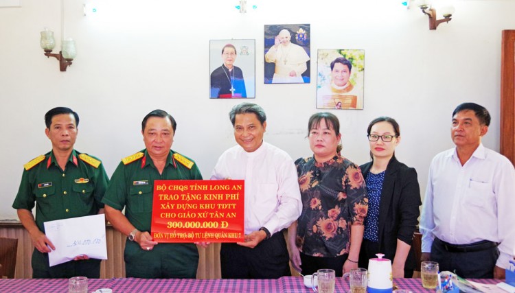 Đại tá Trần Văn Trai - Chỉ huy trưởng Bộ Chỉ huy Quân sự tỉnh Long An phối hợp UBMTTQVN tỉnh, Ban Dân vận Tỉnh ủy, Ban Tôn giáo - Sở Nội vụ trao kinh phí hỗ xây dựng khu thể dục thể thao cho Giáo xứ Tân An và nhà tình nghĩa quân dân cho 2 gia đình giáo dân gặp khó khăn tại huyện Tân Trụ.