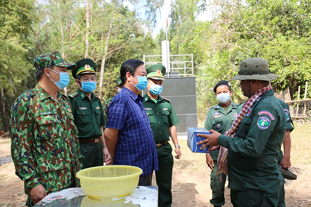Đồng chí Lê Minh Hoan - Ủy viên Trung ương Đảng, Bí thư Tỉnh ủy Đồng Tháp (hàng đầu, đứng giữa) tặng khẩu trang y tế cho lực lượng bảo vệ biên giới Campuchia tại khu vực Ba Nguyên, Đồn Biên phòng Cầu Muống