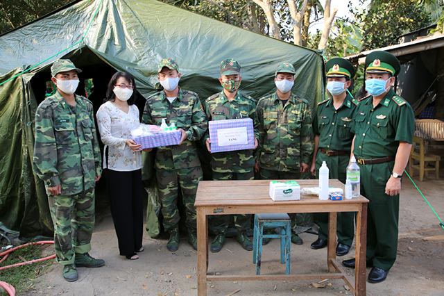 Hội Liên hiệp Phụ nữ và Bộ chỉ huy Bộ đội Biên phòng Đồng Tháp thăm, tặng khẩu trang, nước rửa tay khô cho chốt số 2, Đồn Biên phòng Cầu Muống