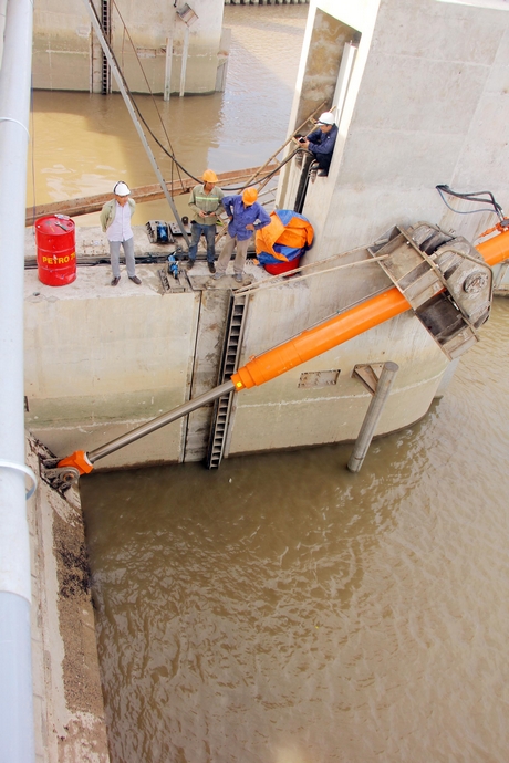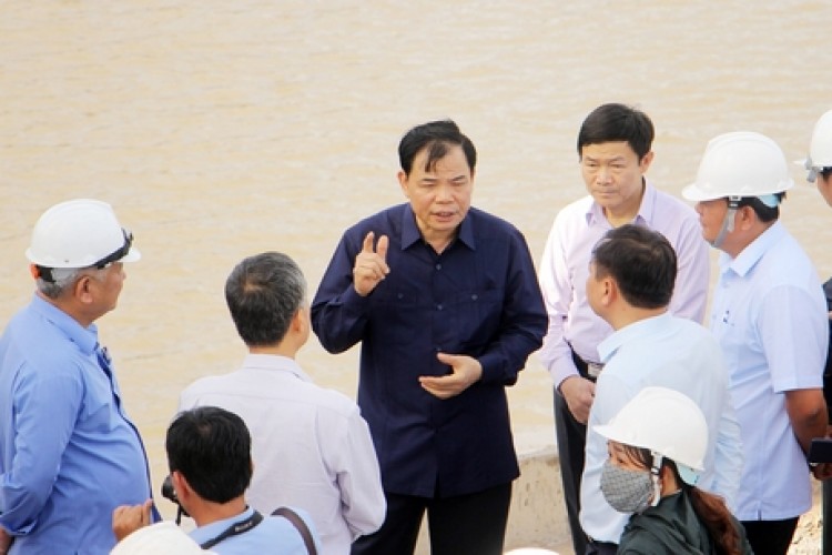 Bộ trưởng Nguyễn Xuân Cường kiểm tra tiến độ thi công cống Bông Bót (Trà Vinh).