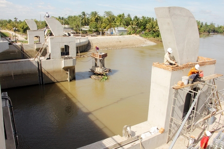 Cống Tân Dinh (giáp 2 tỉnh Vĩnh Long và Trà Vinh) đang được thi công và đủ điều kiện vận hành phục vụ ứng phó với hạn mặn mùa khô 2019- 2020.