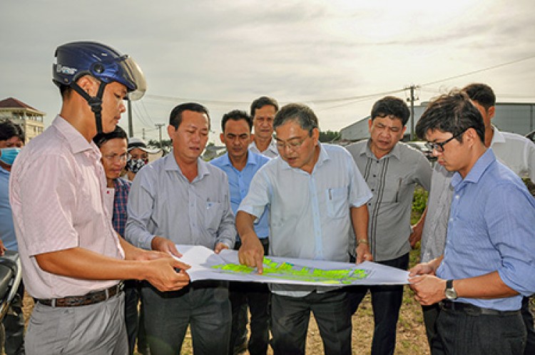 Lãnh đạo tỉnh và đại diện các sở, ban, ngành khảo sát tiến độ thi công tại tuyến đường 3B, Cụm công nghiệp tập trung Đông Phú.