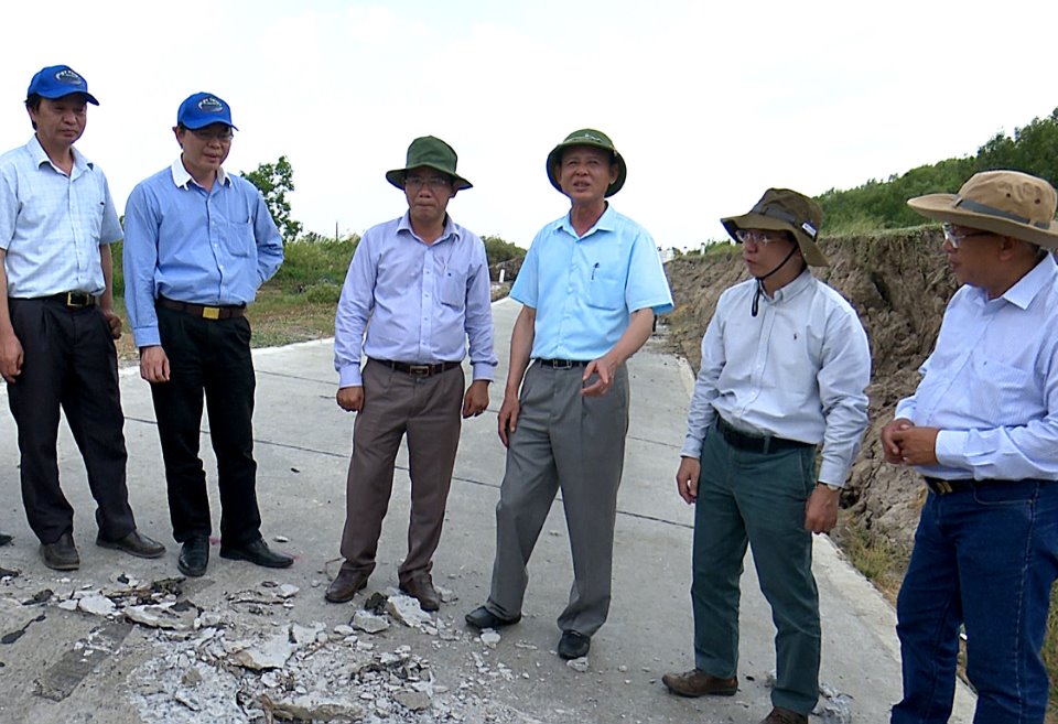 Đoàn công tác của Bộ NN và PTNT khảo sát tình trạng sụp lún đê biển Tây. Ảnh: Hoàng Vũ