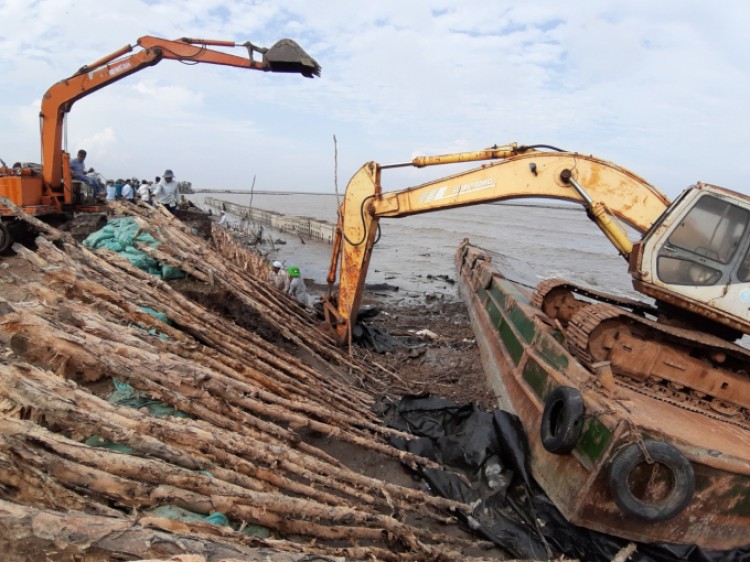 Lực lượng chức năng tỉnh Cà mau thực hiện khắc phục và phòng ngừa vỡ đê biển.