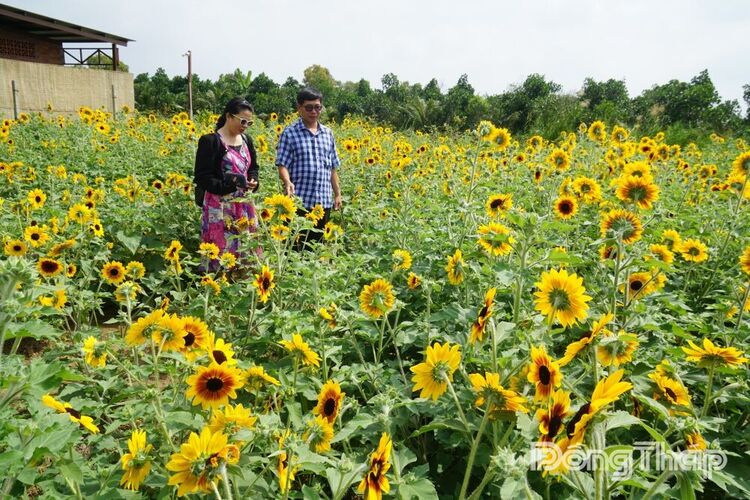 Du khách thích thú check-in tại cánh đồng hoa hướng dương rực rỡ ở điểm du lịch Miền Tây Lodge (xã Tân Dương).