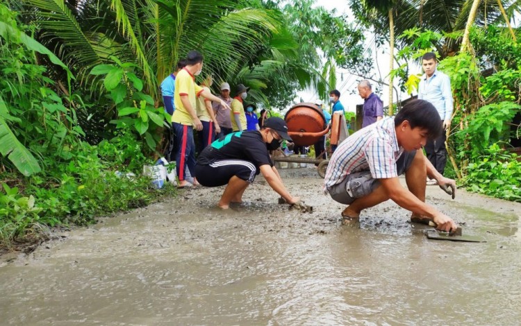 Đoàn viên, thanh niên xã Mỹ Khánh tham gia giặm vá đường giao thông.