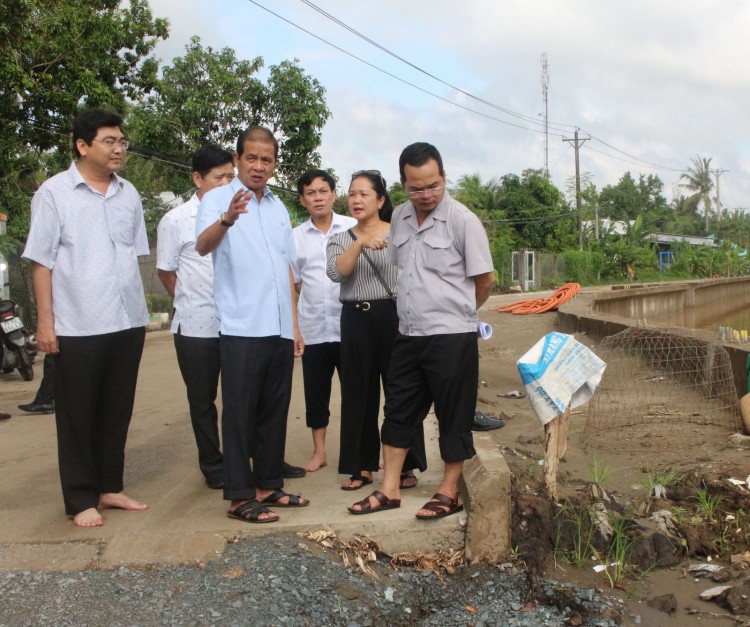 Ông Nguyễn Thanh Dũng, Phó Chủ tịch UBND TP Cần Thơ (hàng đầu, bìa trái), kiểm tra và chỉ đạo đẩy nhanh tiến độ thực hiện công trình kè chống sạt lở, xâm nhập mặn, ứng phó BĐKH khu vực rạch Cái Sơn.