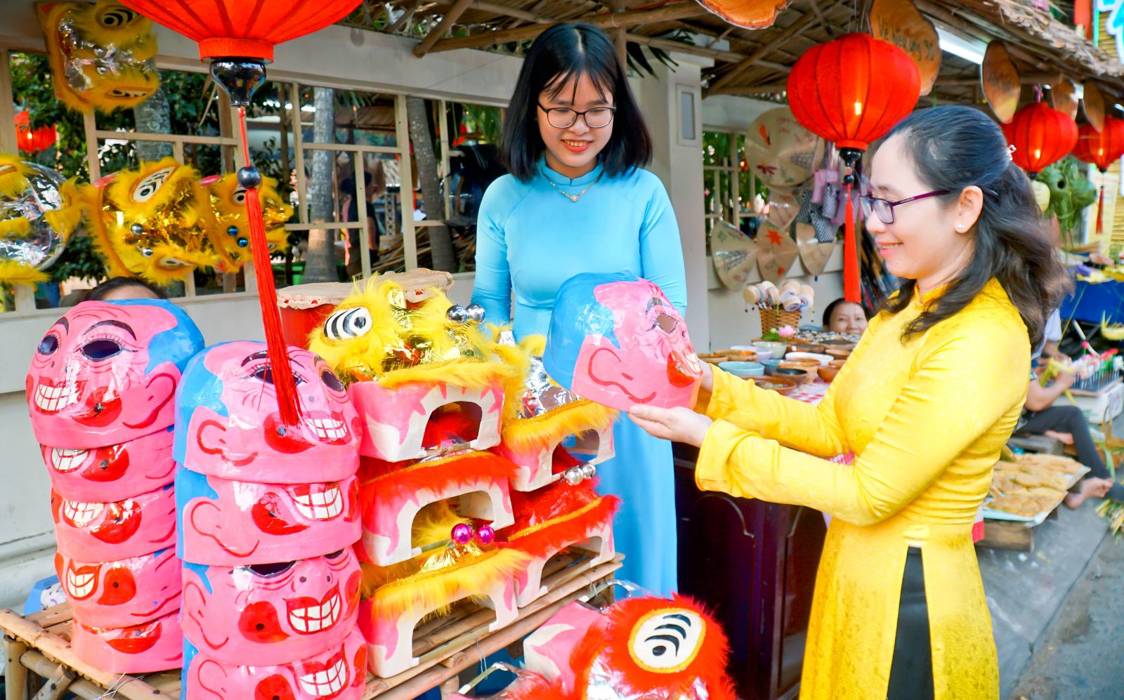 Du khách thích thú tìm hiểu nghề làm đầu Lân, mặt nạ ông Địa của nghệ nhân Cần Thơ. Ảnh: DUY KHÔI