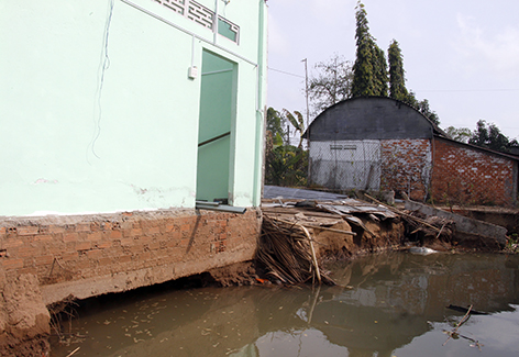 Cách đó không xa, căn nhà của gia đình bà Võ Thị Nga cũng có dấu hiệu răn nứt nhẹ. Nền đất có dấu nứt nhỏ, ảnh hưởng lên phần tường nhà sau sát bờ sông. Bà Nga dự đoán: “Có dấu hiệu báo trước thì sớm muộn gì cũng sụp. Tôi thấy phía sau phần tường bị xé rồi rất nguy hiểm, tôi kêu con tôi đập bỏ để nhà trên không bị ảnh hưởng. Ở thì ở vậy, nhưng tôi thấy lo lắm”.