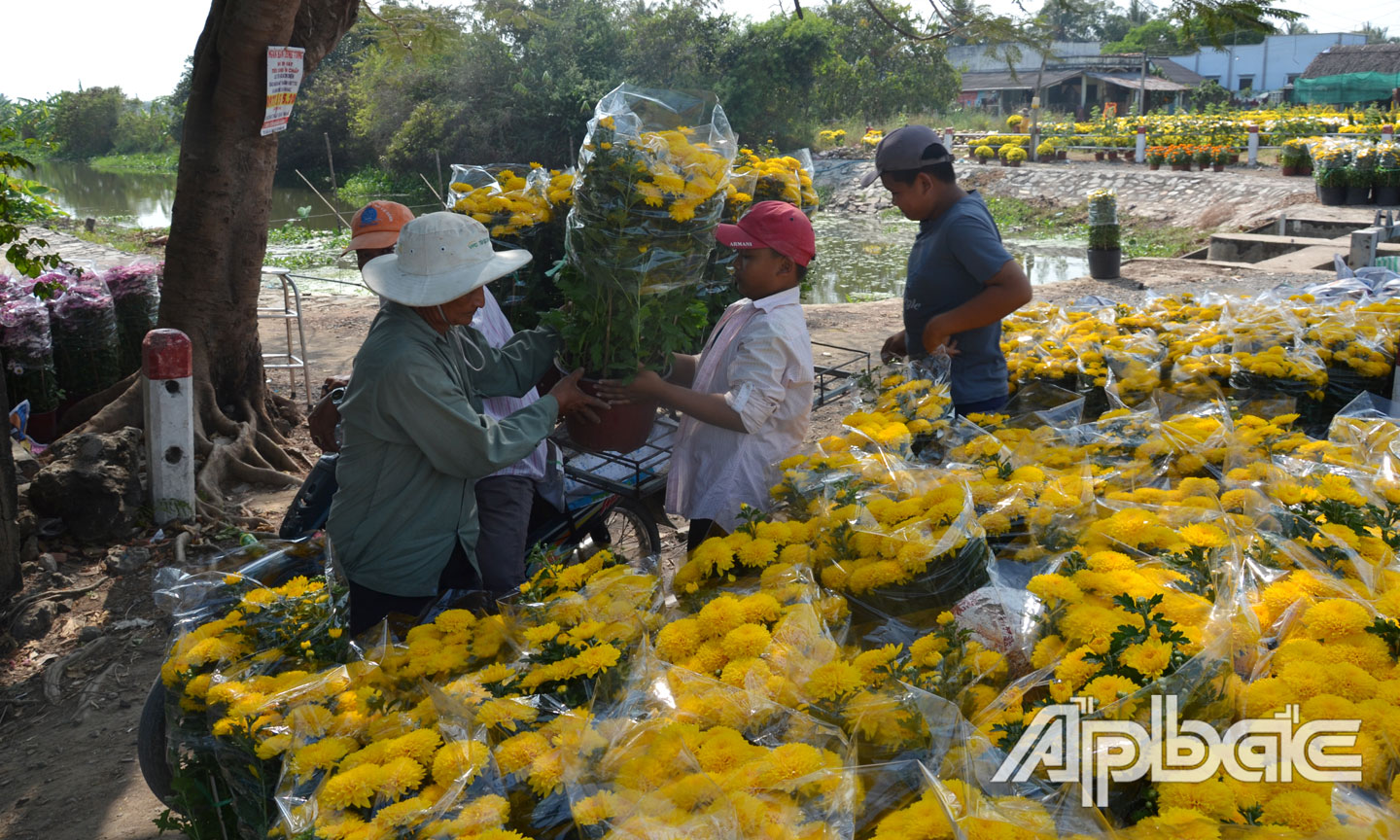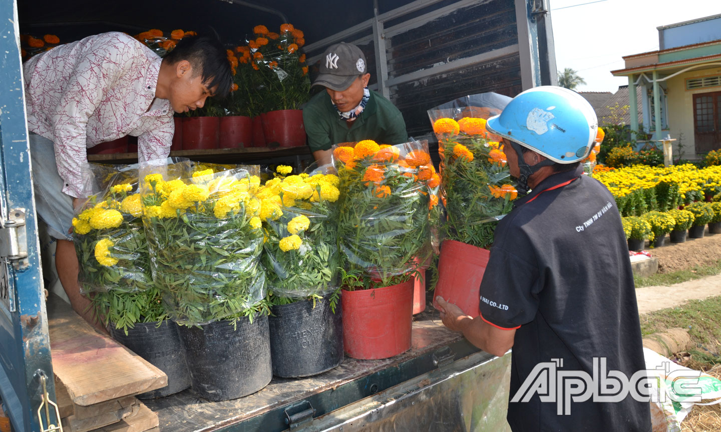 Người trồng hoa ở xã Thạnh Trị, huyện Gò Công Tây vận chuyển hoa lên xe.