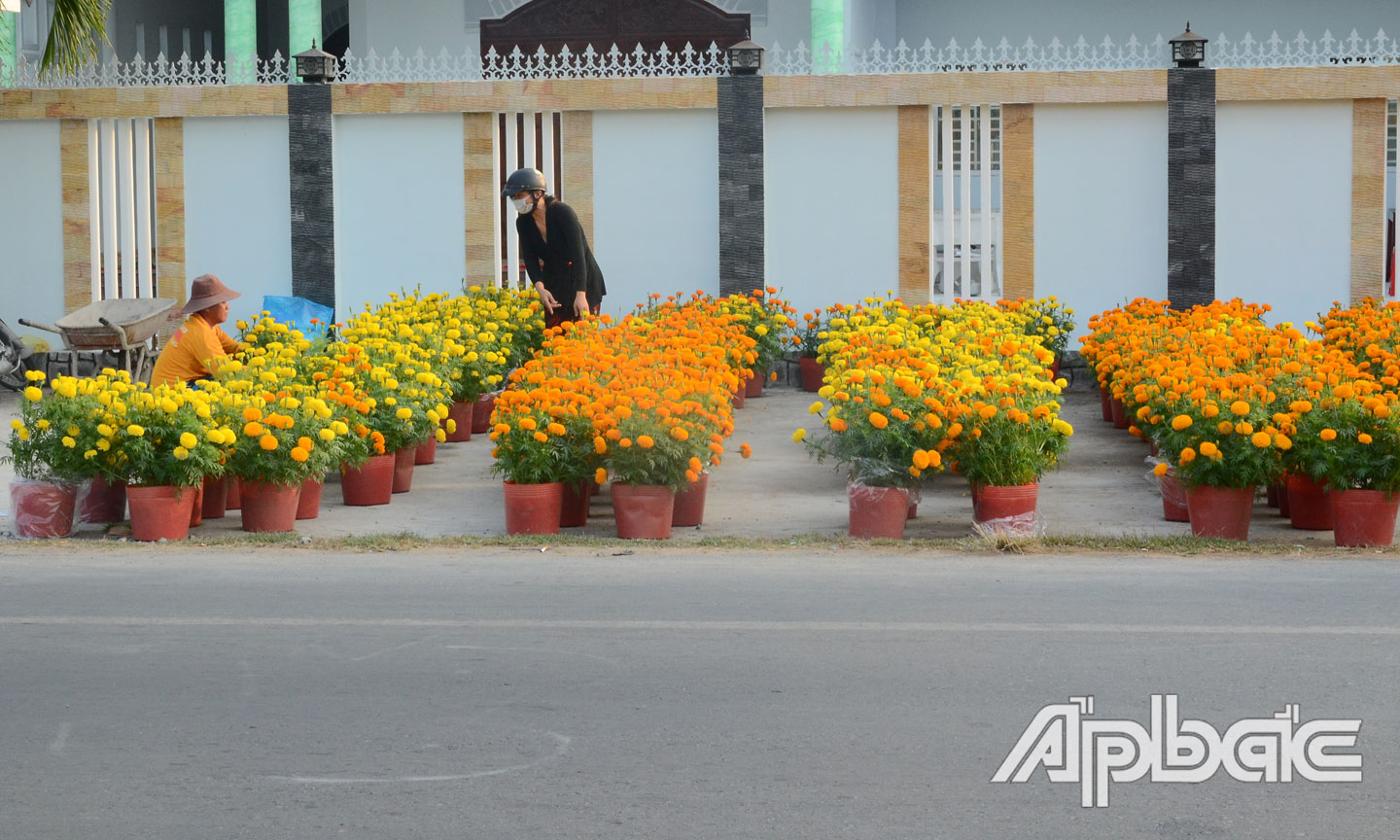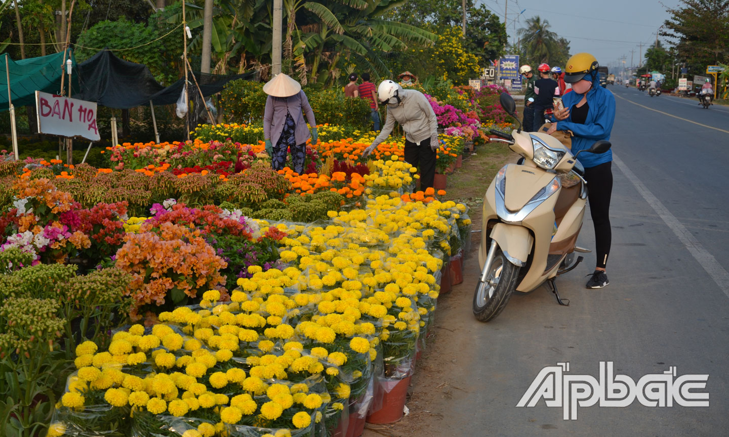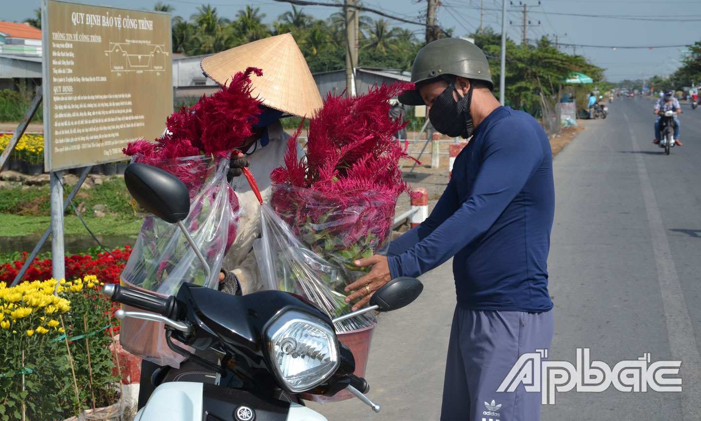 Người dân ghé vào các điểm bán hoa tết dọc Quốc lộ 50 (đoạn qua xã An Thạnh Thủy, huyện Chợ Gạo) để mua hoa.