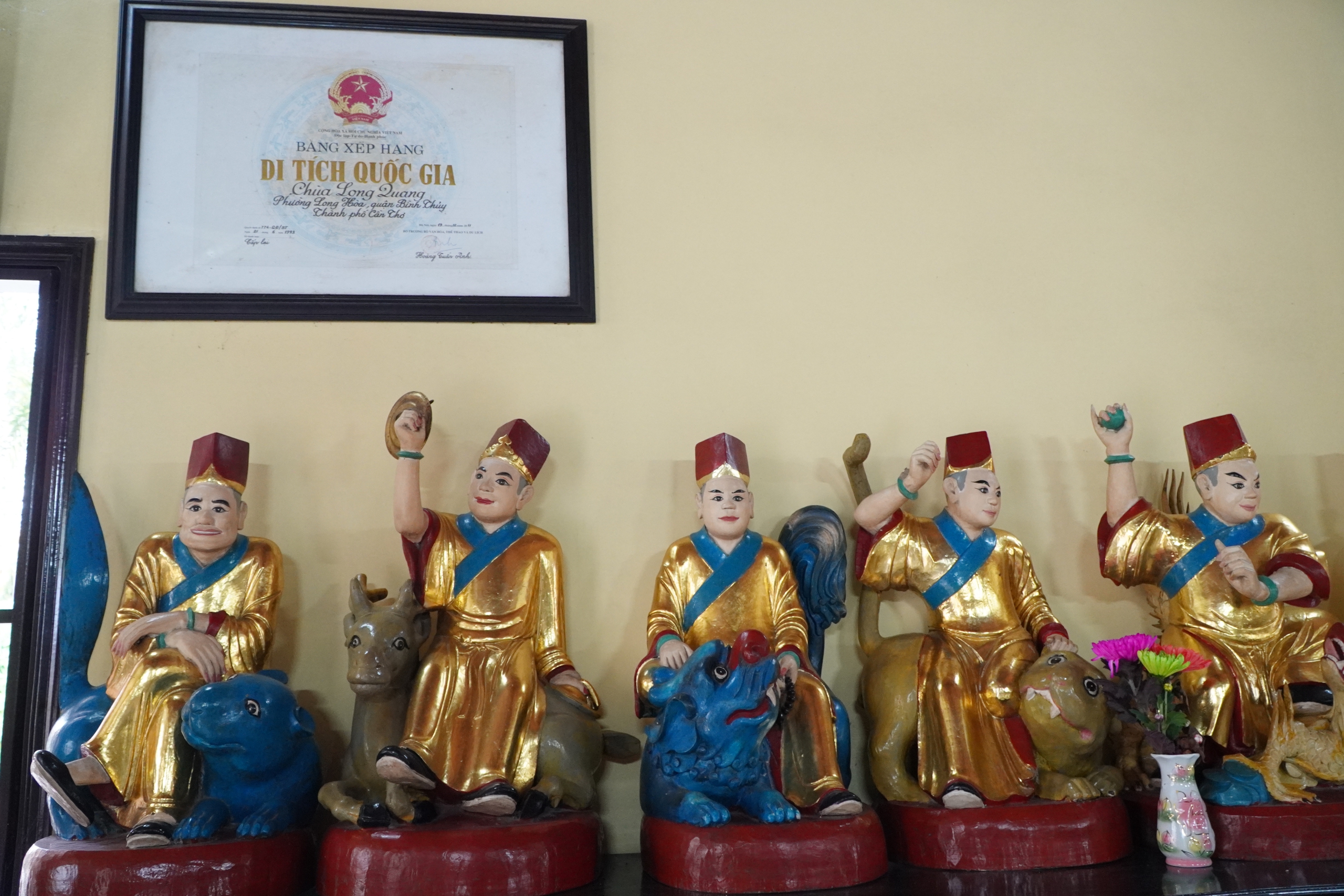 Trải qua hơn 4 lần trùng tu, dấu ấn thời gian của kiến trúc tại chùa Long Quang không còn nhiều nhưng chùa vẫn giữ nguyên vẹn 50 pho tượng làm bằng gỗ quý. Lưu truyền, tất cả pho tượng này được tạc vào đầu những năm 1920. Khi đó, trụ trì chùa là Hòa thượng Từ Quang rước thợ về làm. Bộ tượng 18 vị La Hán được điêu khắc tỉ mỉ, công phu.
