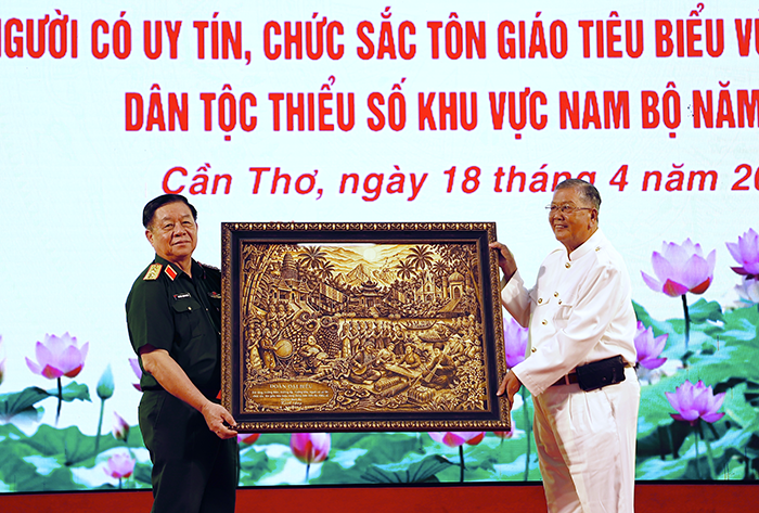 Đại diện già làng, trưởng thôn, trưởng ấp, trưởng khu, người có uy tín, chức sắc tôn giáo tiêu biểu vùng đồng bào dân tộc thiểu số khu vực Nam Bộ tặng quà Thủ trưởng Tổng cục Chính trị. Ảnh: HỒNG VÂN