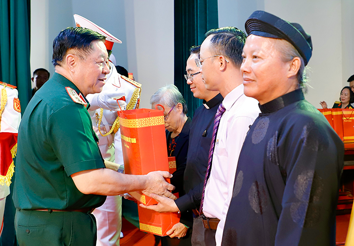 Đại tướng Nguyễn Trọng Nghĩa, Ủy viên Bộ Chính trị, Bí thư Trung ương Đảng, Ủy viên Thường vụ Quân ủy Trung ương, Chủ nhiệm Tổng cục Chính trị Quân đội nhân dân Việt Nam tặng quà các đại biểu. Ảnh: HỒNG VÂN
