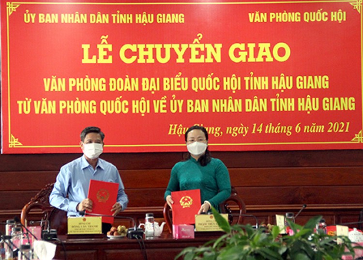 Đồng chí: Phạm Thúy Chinh - Phó Chủ nhiệm Văn phòng Quốc hội và đồng chí Đồng Văn Thanh - Chủ tịch UBND tỉnh Hậu Giang đã ký kết biên bản chuyển giao công chức, người lao động, cơ sở vật chất, kinh phí của Văn phòng Đoàn đại biểu Quốc hội tỉnh Hậu Giang về UBND tỉnh trên tinh thần giữ nguyên trạng chức năng, nhiệm vụ, số lượng công chức, hợp đồng lao động hiện có, đảm bảo sự ổn định, xuyên suốt của công tác tổ chức, công tác chuyên môn.