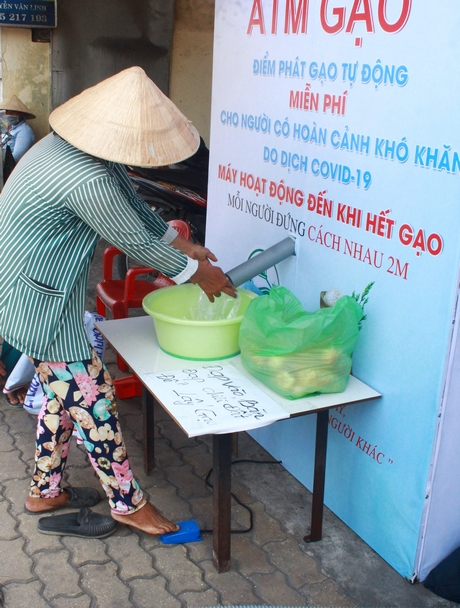 “ATM gạo”- điểm phát gạo tự động miễn phí do một nhóm chủ doanh nghiệp trẻ thực hiện bắt đầu hoạt động tại số 335 đường Nguyễn Văn Linh, phường An Khánh (quận Ninh Kiều- TP Cần Thơ) từ sáng 16/4/2020. Điểm đặt “ATM có trang bị nước sát khuẩn và khẩu trang. Người đến nhận gạo được hướng dẫn rửa tay, đeo khẩu trang đúng cách và đứng thành hàng cách nhau 2m. Đến lượt vào ATM, người nhận nhấn nút dưới chân thì dòng gạo tuôn chảy, mỗi người nhận 1,5 ký gạo.