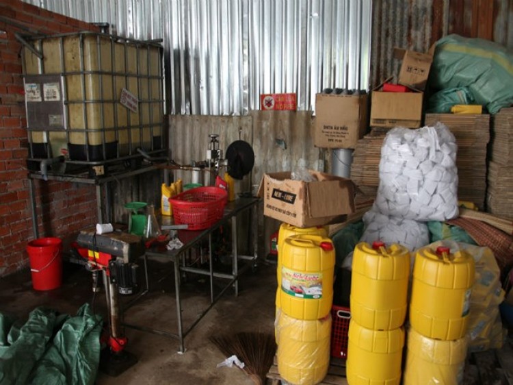 Tiến hành kiểm tra kho hàng chi nhánh Bành Âu Hấu, công an cũng phát hiện 8 thùng và 20 chai nhớt thành phẩm (khoảng 164 lít) cùng nhiều vỏ hộp và dụng cụ để sản xuất nhớt giả.