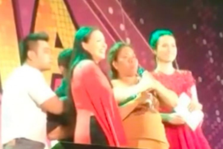 Nữ khán giả cầm micro lên sân khấu nói bị mất 1 lượng vàng khi xem đêm nhạc. Ảnh: cắt từ clip