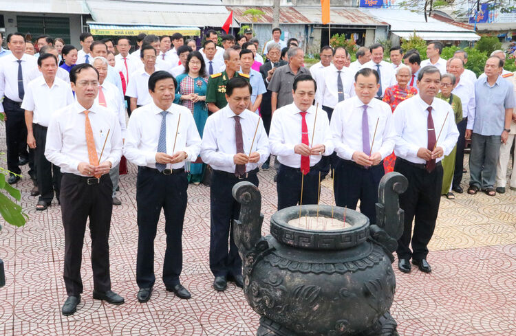 Đồng chí đồng chí Bùi Văn Nghiêm- Ủy viên BCH Trung ương Đảng, Phó Trưởng Ban Nội chính Trung ương; đồng chí Trần Văn Lâu- Bí thư Tỉnh ủy Vĩnh Long, cùng các đồng chí lãnh đạo, nguyên lãnh đạo tỉnh thắp hương di tích Tượng đài Đốc binh Lê Cẩn - Nguyễn Giao.