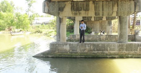 Cán bộ Phòng Nông nghiệp- PTNT huyện Vũng Liêm (tỉnh Vĩnh Long) đo mặn tại cống Nàng Âm.