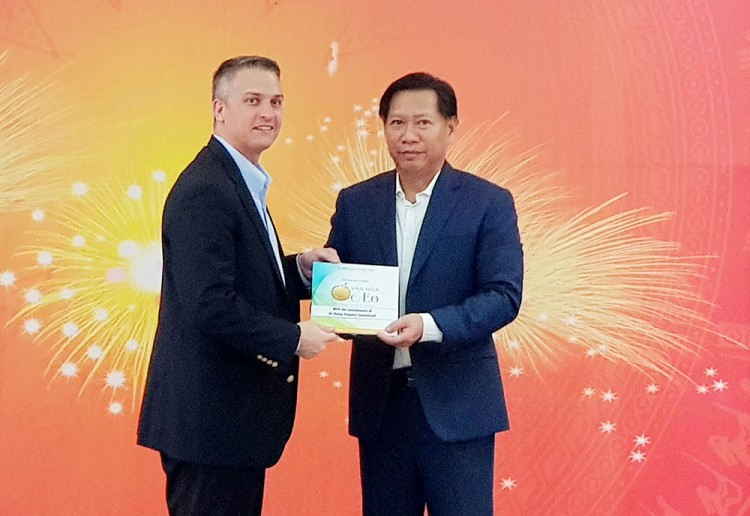 Phó Chủ tịch UBND tỉnh An Giang Trần Anh Thư (phải) tặng quà đại tá Thomas Stevenson
