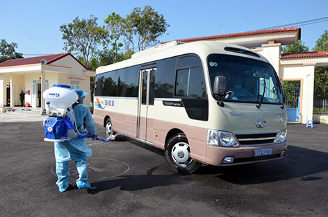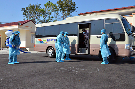 Khi xe đến cổng nơi cách ly tại trung tâm, sẽ có nhân viên quân y xịt tiêu độc, khử trùng toàn bộ xe.