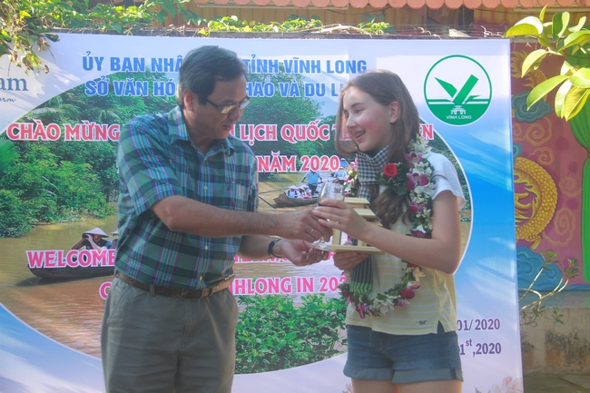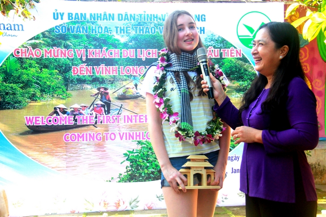 Cô Sasha (trái) được chọn là vị khách đầu tiên đến tỉnh Vĩnh Long.