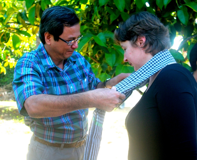 Tặng quà cho các thành viên đoàn du khách đến từ Anh quốc.