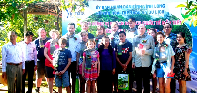 Đoàn khách quốc tế đầu tiên đến tỉnh Vĩnh Long, chụp ảnh lưu niệm tại Homestay Út Trinh.