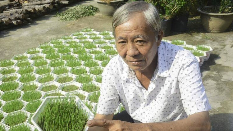 Ông Phương trồng lúa trong chậu bán mỗi dịp Tết.