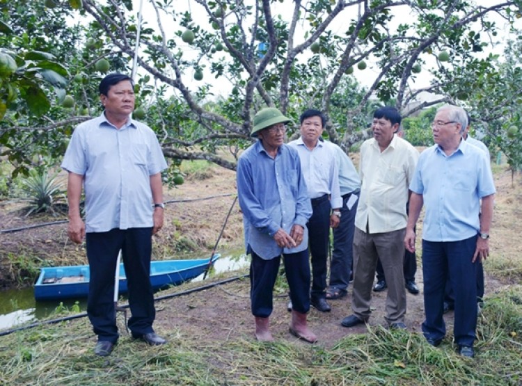 Ông Phan Văn Sáu, Bí thư Tỉnh ủy Sóc Trăng (ngoài cùng bên phải) tham quan mô hình trồng bưởi của lão nông Ông Văn Hùng.