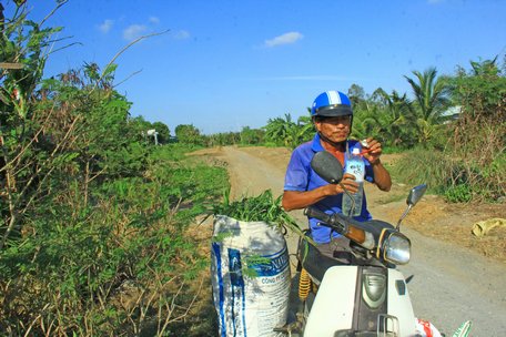 Chú Năm uống ngụm nước giải khát, sau khi cắt đầy bao cỏ dọc kinh 14.