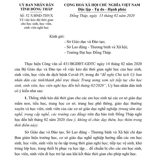 Văn bản về việc kéo dài thời gian cho học sinh, học viên, sinh viên nghỉ học